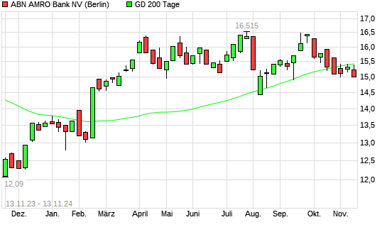Mit dem Rücksetzer auf 15,28 EUR hat die ABN Amro Group-Aktie am 12.11.2024 die 200-Tage-Linie nach unten gekreuzt.