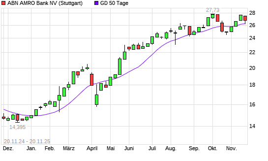 Mit dem Rücksetzer auf 26,26 EUR hat die ABN Amro Group-Aktie am 19.11.2025 die 50-Tage-Linie nach unten gekreuzt.