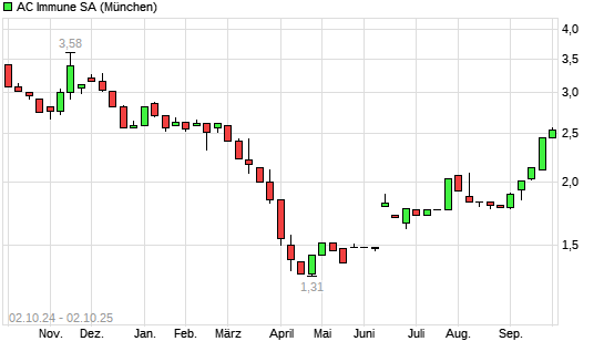 Mit dem Anstieg auf 2,54 EUR hat die AC Immune SA-Aktie (ISIN CH0329023102) am 01.10.2025 ein neues 6-Monats-Hoch erreicht und damit den Kurs vom 30.09.2025 eingestellt.