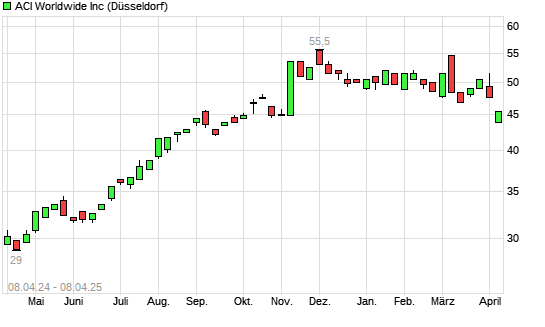Mit dem Rücksetzer auf 44,00 EUR hat die ACI Worldwide-Aktie (ISIN US0044981019) am 07.04.2025 ein neues 6-Monats-Tief erreicht und damit den Kurs vom 25.10.2024 eingestellt.