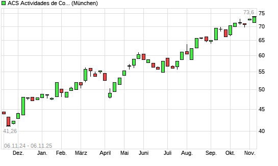 Mit dem Anstieg auf 74,20 EUR hat die ACS Actividades de Construccion y Servicios SA-Aktie (ISIN ES0167050915) am 05.11.2025 ein neues All-Time-High erreicht und damit den Kurs vom 27.10.2025 eingestellt.