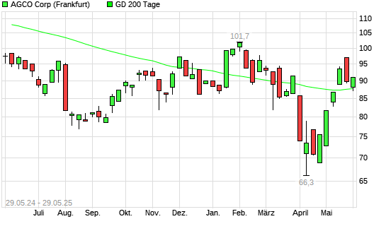 Mit dem Anstieg auf 88,94 EUR hat die AGCO-Aktie am 28.05.2025 die 200-Tage-Linie nach oben gekreuzt.