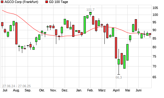 Mit dem Rücksetzer auf 85,54 EUR hat die AGCO-Aktie am 26.06.2025 die 100-Tage-Linie nach unten gekreuzt.