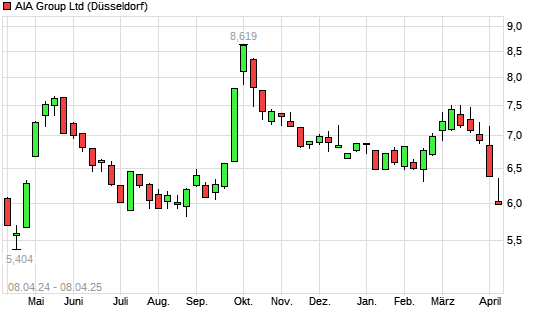 Mit dem Rücksetzer auf 6,07 EUR hat die AIA Group-Aktie (ISIN HK0000069689) am 07.04.2025 ein neues 6-Monats-Tief erreicht und damit den Kurs vom 11.02.2025 eingestellt.