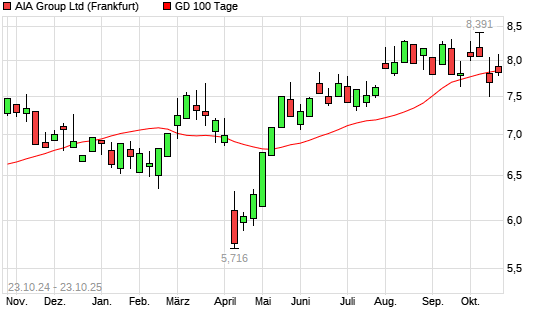 Mit dem Rücksetzer auf 7,78 EUR hat die AIA Group-Aktie am 22.10.2025 die 100-Tage-Linie nach unten gekreuzt.