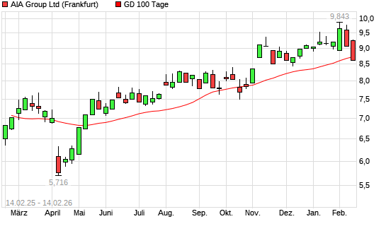 Mit dem Rücksetzer auf 8,62 EUR hat die AIA Group-Aktie am 13.02.2026 die 100-Tage-Linie nach unten gekreuzt.