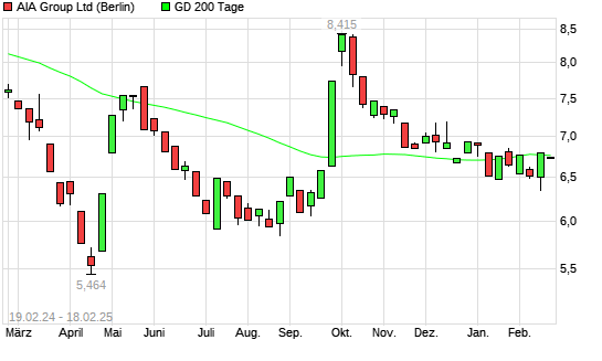 Mit dem Rücksetzer auf 6,74 EUR hat die AIA Group-Aktie am 17.02.2025 die 200-Tage-Linie nach unten gekreuzt.