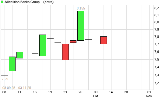 Mit dem Anstieg auf 8,01 EUR hat die AIB Group (WKN: A2DW7N) am 03.11.2025 ein neues 5-Jahres-Hoch erreicht und damit den Kurs vom 18.09.2025 eingestellt.