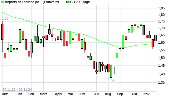 Mit dem Anstieg auf 1,61 EUR hat die AIRPORTS OF THAI UTS-Aktie am 18.11.2024 die 200-Tage-Linie nach oben gekreuzt.