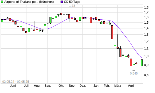 Mit dem Anstieg auf 1,06 EUR hat die AIRPORTS OF THAI UTS-Aktie am 02.05.2025 die 50-Tage-Linie nach oben gekreuzt.