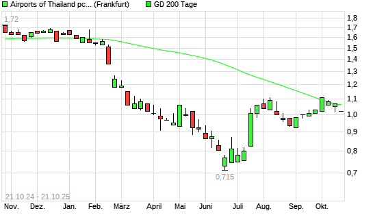 Mit dem Rücksetzer auf 1,02 EUR hat die AIRPORTS OF THAI UTS-Aktie am 20.10.2025 die 200-Tage-Linie nach unten gekreuzt.