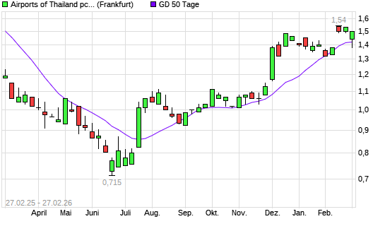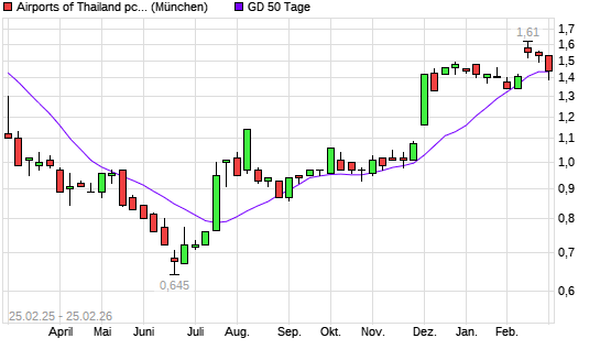 Mit dem Anstieg auf 1,46 EUR hat die AIRPORTS OF THAI UTS-Aktie am 26.02.2026 die 50-Tage-Linie nach oben gekreuzt.Die AIRPORTS OF THAI UTS-Aktie befindet sich seit dem 29.10.2025 ...weiterlesen