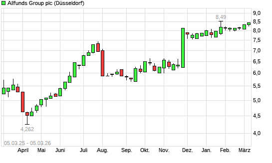 Mit dem Anstieg auf 8,39 EUR hat die ALLFUNDS GROUP-Aktie (ISIN GB00BNTJ3546) am 04.03.2026 ein neues 3-Jahres-Hoch erreicht und damit den Kurs vom 03.03.2026 eingestellt.