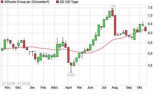 Mit dem Rücksetzer auf 6,18 EUR hat die ALLFUNDS GROUP-Aktie am 16.10.2025 die 100-Tage-Linie nach unten gekreuzt.