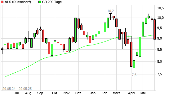 Mit dem Rücksetzer auf 9,05 EUR hat die ALS-Aktie am 28.05.2025 die 200-Tage-Linie nach unten gekreuzt.