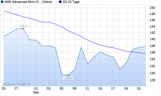 Mit dem Rücksetzer auf 135,40 EUR hat die AMD-Aktie am 23.09.2025 die 20-Tage-Linie nach unten gekreuzt.
