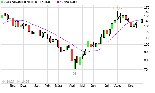 Mit dem Rücksetzer auf 139,82 EUR hat die AMD-Aktie am 03.10.2025 die 50-Tage-Linie nach unten gekreuzt.