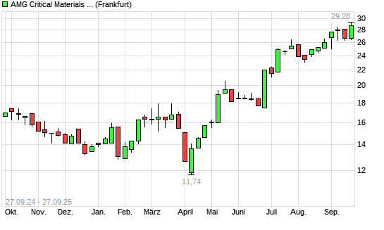 Mit dem Anstieg auf 28,70 EUR hat die AMG Advanced Metallurgical Group-Aktie (ISIN NL0000888691) am 26.09.2025 ein neues 12-Monats-Hoch erreicht und damit den Kurs vom 08.09.2025 eingestellt.