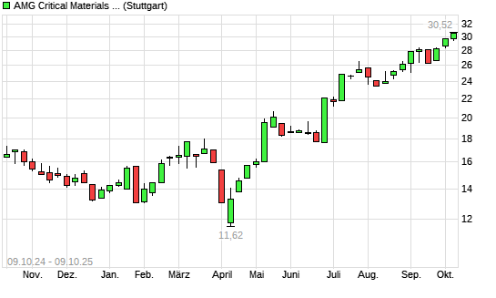 Mit dem Anstieg auf 30,32 EUR hat die AMG Advanced Metallurgical Group-Aktie (ISIN NL0000888691) am 08.10.2025 ein neues 12-Monats-Hoch erreicht und damit den Kurs vom 06.10.2025 eingestellt.