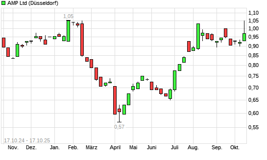 Mit dem Anstieg auf 1,04 EUR hat die AMP-Aktie (ISIN AU000000AMP6) am 16.10.2025 ein neues 6-Monats-Hoch erreicht und damit den Kurs vom 08.08.2025 eingestellt.