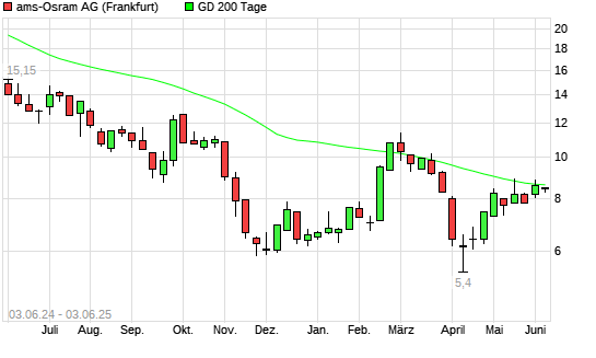 Mit dem Rücksetzer auf 8,26 EUR hat die AMS-Aktie am 02.06.2025 die 200-Tage-Linie nach unten gekreuzt.