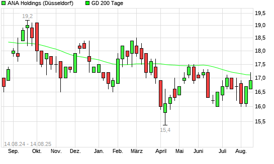 Mit dem Rücksetzer auf 17,20 EUR hat die ANA Holdings-Aktie am 13.08.2025 die 200-Tage-Linie nach unten gekreuzt.