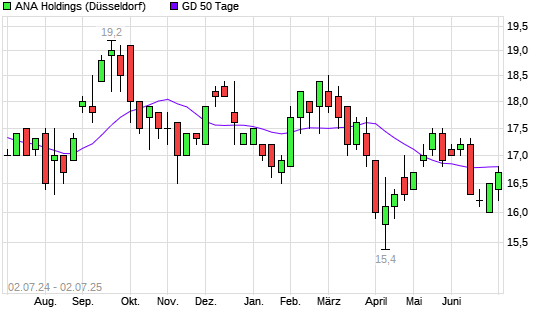 Mit dem Rücksetzer auf 16,50 EUR hat die ANA Holdings-Aktie am 01.07.2025 die 50-Tage-Linie nach unten gekreuzt.