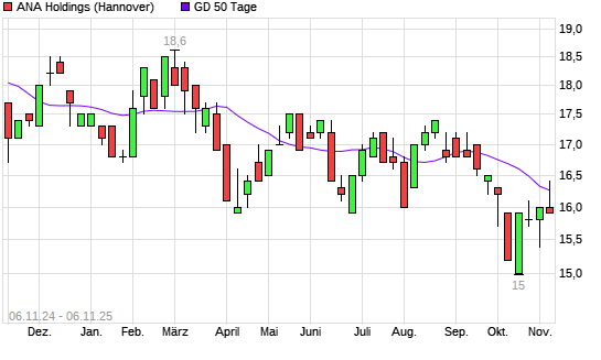 Mit dem Rücksetzer auf 16,10 EUR hat die ANA Holdings-Aktie am 05.11.2025 die 50-Tage-Linie nach unten gekreuzt.