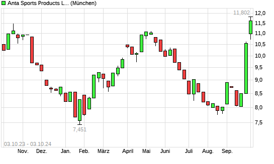 Mit dem Anstieg auf 11,56 EUR hat die ANTA Sports Products-Aktie (ISIN KYG040111059) am 02.10.2024 ein neues 12-Monats-Hoch erreicht und damit den Kurs vom 24.10.2023 eingestellt.