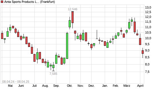 Mit dem Rücksetzer auf 8,75 EUR hat die ANTA Sports Products-Aktie (ISIN KYG040111059) am 07.04.2025 ein neues 6-Monats-Tief erreicht und damit den Kurs vom 28.11.2024 eingestellt.