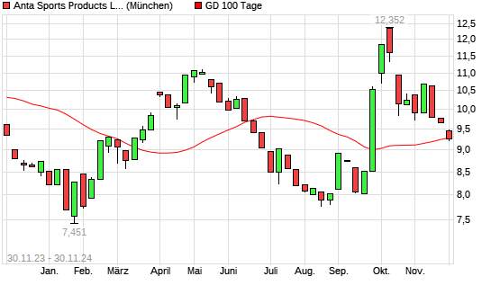 Mit dem Anstieg auf 9,20 EUR hat die ANTA Sports Products-Aktie am 29.11.2024 die 100-Tage-Linie nach oben gekreuzt.