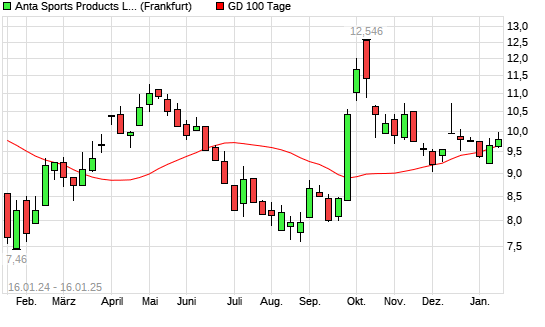 Mit dem Rücksetzer auf 9,68 EUR hat die ANTA Sports Products-Aktie am 15.01.2025 die 100-Tage-Linie nach unten gekreuzt.