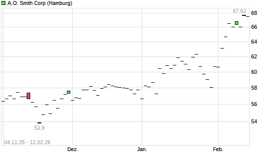 Mit dem Anstieg auf 67,30 EUR hat die A.O. Smith-Aktie (ISIN US8318652091) am 11.02.2026 ein neues 12-Monats-Hoch erreicht und damit den Kurs vom 06.02.2026 eingestellt.