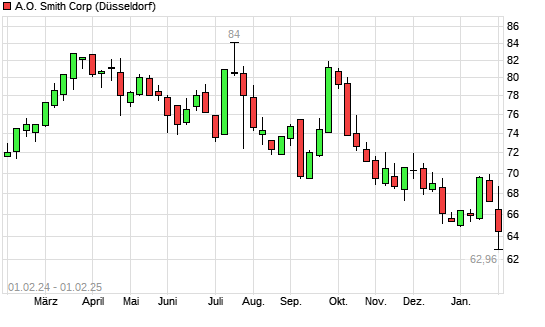 Mit dem Rücksetzer auf 65,18 EUR hat die A.O. Smith-Aktie (ISIN US8318652091) am 31.01.2025 ein neues 12-Monats-Tief erreicht und damit den Kurs vom 30.12.2024 eingestellt.