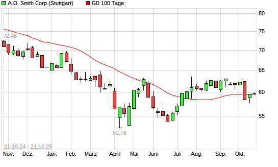 Mit dem Anstieg auf 59,78 EUR hat die A.O. Smith-Aktie am 20.10.2025 die 100-Tage-Linie nach oben gekreuzt.