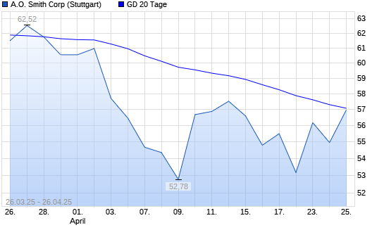 Mit dem Anstieg auf 57,60 EUR hat die A.O. Smith-Aktie am 25.04.2025 die 20-Tage-Linie nach oben gekreuzt.