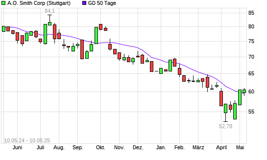 Mit dem Anstieg auf 60,42 EUR hat die A.O. Smith-Aktie am 09.05.2025 die 50-Tage-Linie nach oben gekreuzt.