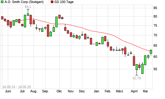 Mit dem Rücksetzer auf 60,68 EUR hat die A.O. Smith-Aktie am 15.05.2025 die 100-Tage-Linie nach unten gekreuzt.