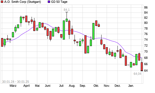 Mit dem Rücksetzer auf 66,82 EUR hat die A.O. Smith-Aktie am 29.01.2025 die 50-Tage-Linie nach unten gekreuzt.