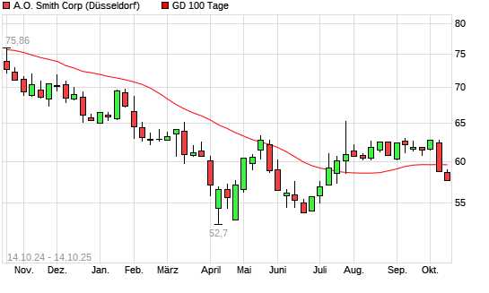 Mit dem Rücksetzer auf 58,88 EUR hat die A.O. Smith-Aktie am 13.10.2025 die 100-Tage-Linie nach unten gekreuzt.Die A.O. Smith-Aktie befindet sich seit dem 10.10.2025 im langfristigen Abwärtstrend ...weiterlesen