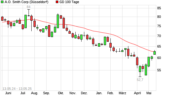 Mit dem Anstieg auf 62,40 EUR hat die A.O. Smith-Aktie am 12.05.2025 die 100-Tage-Linie nach oben gekreuzt.Die A.O. Smith-Aktie befindet sich seit dem 14.10.2024 im langfristigen Abwärtstrend ...weiterlesen