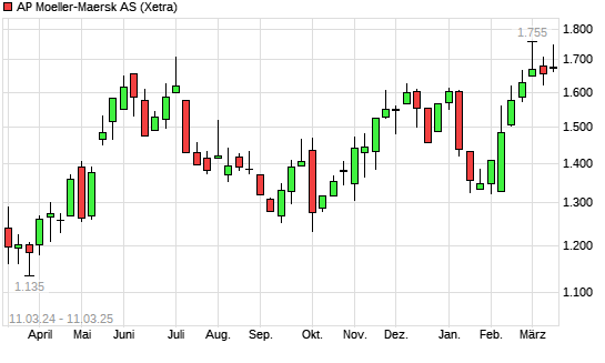 Mit dem Anstieg auf 1.743,00 EUR hat die AP Moeller-Maersk A-Aktie (ISIN DK0010244425) am 10.03.2025 ein neues 12-Monats-Hoch erreicht und damit den Kurs vom 26.02.2025 eingestellt.
