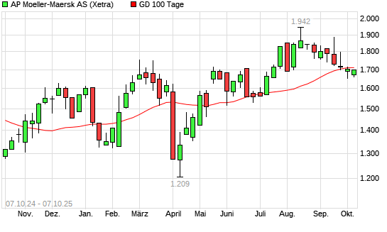 Mit dem Anstieg auf 1.708,00 EUR hat die AP Moeller-Maersk A-Aktie am 06.10.2025 die 100-Tage-Linie nach oben gekreuzt.