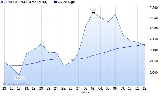 Mit dem Rücksetzer auf 2.098,00 EUR hat die AP Moeller-Maersk A-Aktie am 12.03.2026 die 20-Tage-Linie nach unten gekreuzt.