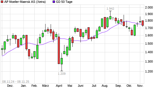 Mit dem Rücksetzer auf 1.734,00 EUR hat die AP Moeller-Maersk A-Aktie am 07.11.2025 die 50-Tage-Linie nach unten gekreuzt.