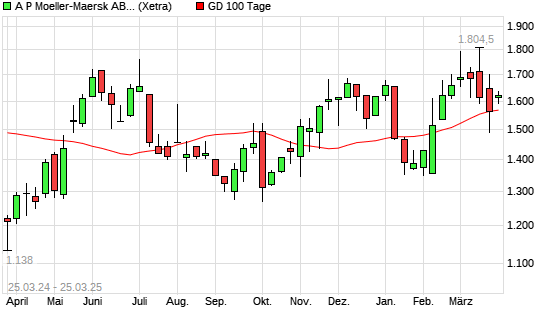 Mit dem Anstieg auf 1.601,50 EUR hat die AP Moeller-Maersk B-Aktie am 24.03.2025 die 100-Tage-Linie nach oben gekreuzt.