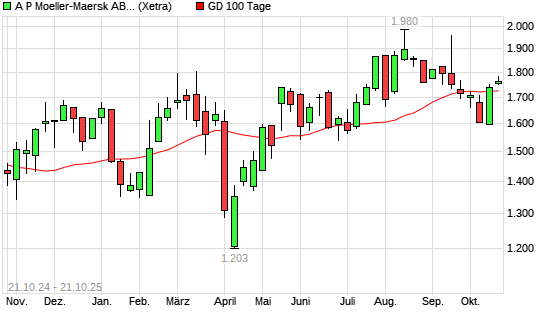 Mit dem Anstieg auf 1.745,50 EUR hat die AP Moeller-Maersk B-Aktie am 20.10.2025 die 100-Tage-Linie nach oben gekreuzt.