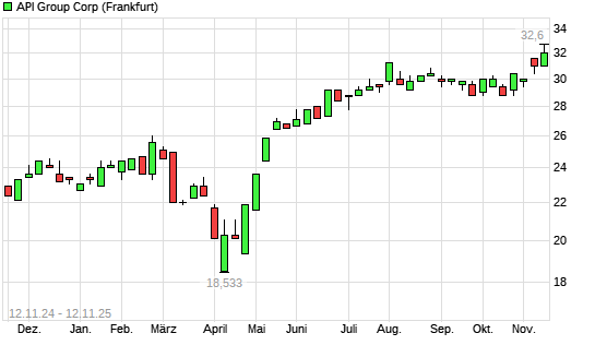 Mit dem Anstieg auf 32,60 EUR hat die API Group-Aktie (ISIN US00187Y1001) am 11.11.2025 ein neues All-Time-High erreicht und damit den Kurs vom 03.11.2025 eingestellt.