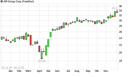 Mit dem Anstieg auf 34,20 EUR hat die API Group-Aktie (ISIN US00187Y1001) am 01.12.2025 ein neues All-Time-High erreicht und damit den Kurs vom 26.11.2025 eingestellt.