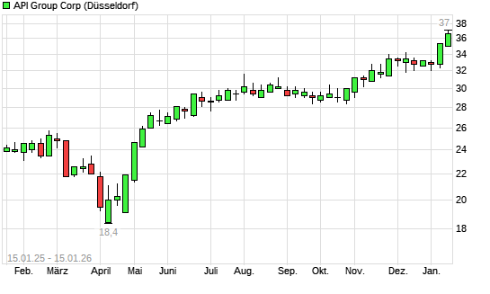Mit dem Anstieg auf 36,40 EUR hat die API Group-Aktie (ISIN US00187Y1001) am 14.01.2026 ein neues All-Time-High erreicht und damit den Kurs vom 13.01.2026 eingestellt.